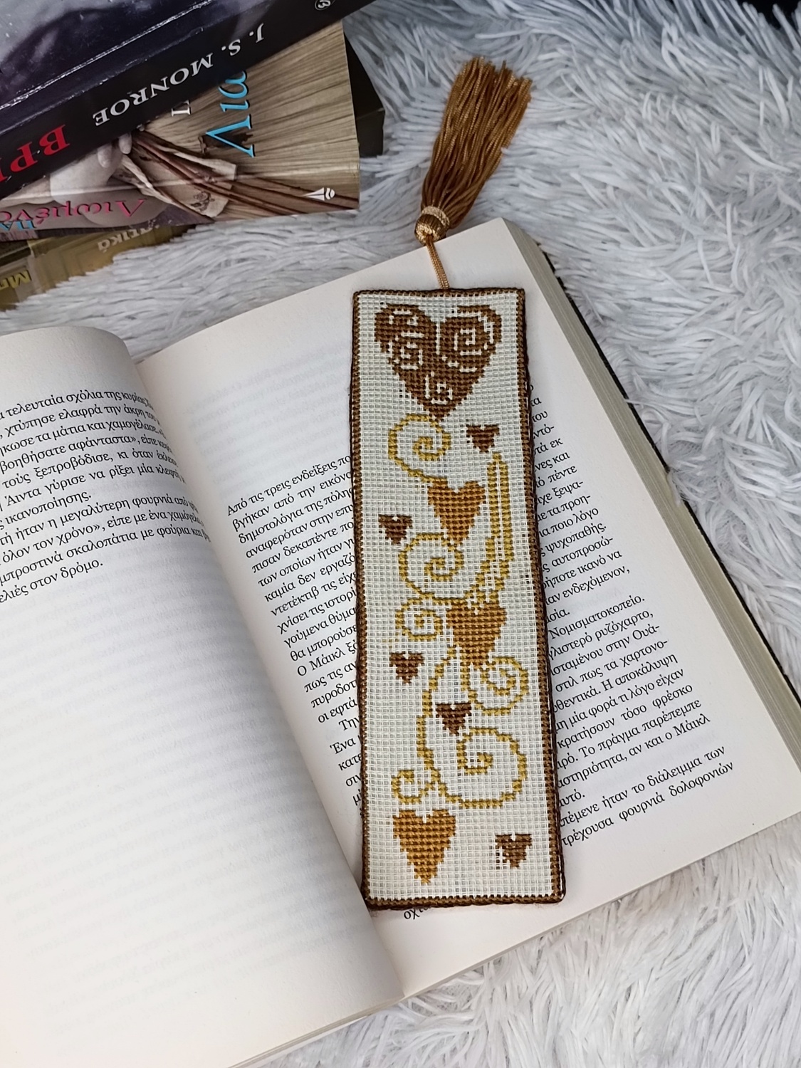 Κεντημένος χειροποίητος σελιδοδείκτης για αναγνώστες με χρυσή καρδιά. Διάσταση ~18x5cm