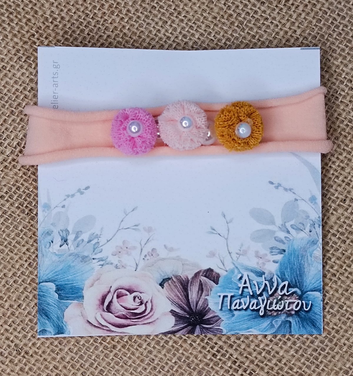 Χειροποίητη Ελαστική Κορδέλα Μαλλιών σε Σομόν Χρώμα με Υφασμάτινα Λουλούδια και Πέρλες
