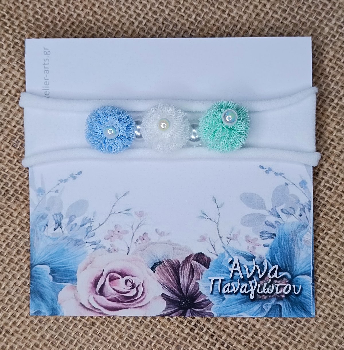 Χειροποίητη Ελαστική Κορδέλα Μαλλιών σε Λευκό Χρώμα με Πομ Πομ και Πέρλες
