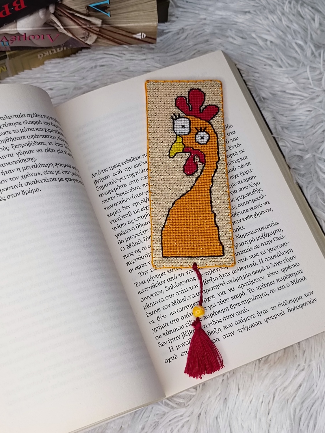 Δώστε μια δόση χιούμορ στο διάβασμά σας με αυτόν τον μοναδικό, χειροποίητο σελιδοδείκτη! Κεντημένος εξ ολοκλήρου στο χέρι με την τεχνική της σταυροβελονιάς (cross stitch), απεικονίζει την “τρελή κότα” με έντονα χρώματα. Είναι κατασκευασμένος πάνω σε ειδικό πλαστικό καμβά για μεγάλη αντοχή και διακοσμημένος με μια κομψή μπορντό φούντα και ξύλινη χάντρα. Ιδανικό δώρο για βιβλιοφάγους που αγαπούν τα ιδιαίτερα αξεσουάρ.