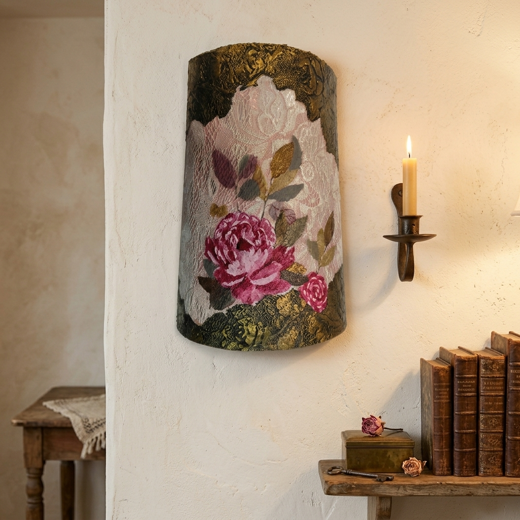 Φέρτε τη ρομαντική ατμόσφαιρα μιας άλλης εποχής στο χώρο σας με αυτό το εξαιρετικό, χειροποίητο διακοσμητικό κεραμίδι. Αυτό το κομμάτι δεν είναι απλώς ένα διακοσμητικό· είναι ένα έργο τέχνης που συνδυάζει πολλαπλές τεχνικές για να δημιουργήσει ένα μοναδικό, ανάγλυφο αποτέλεσμα.