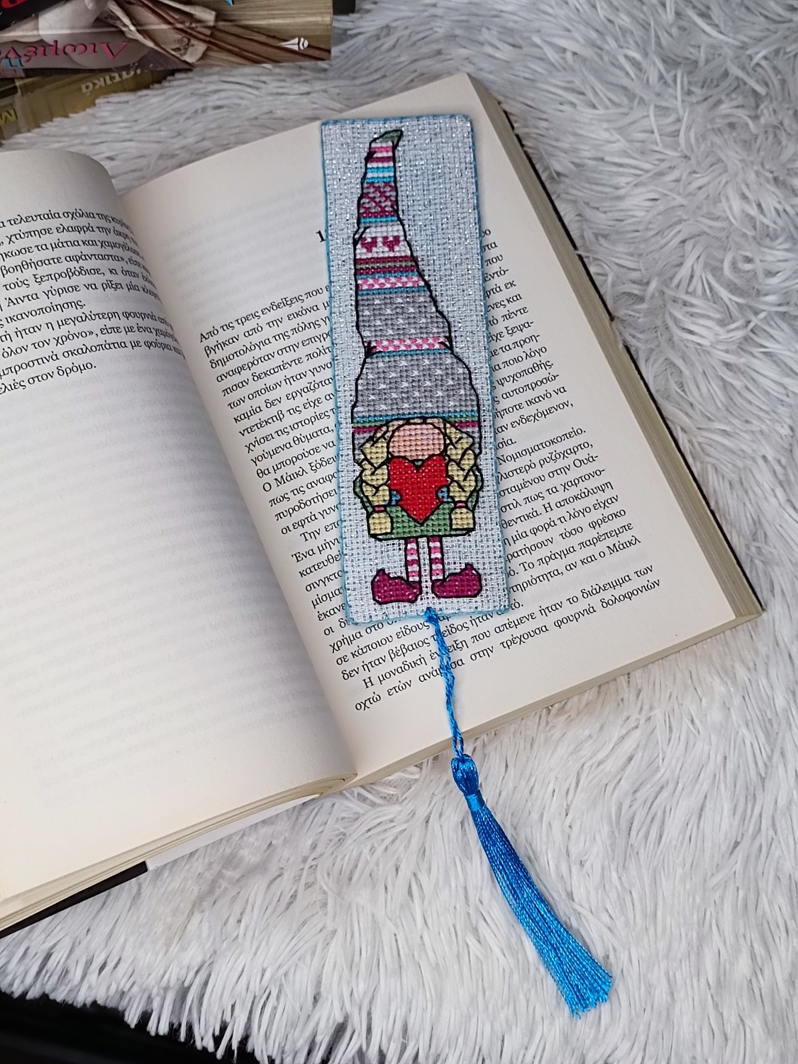 Χαρίστε μια νότα θαλπωρής στο διάβασμά σας με αυτόν τον χειροποίητο σελιδοδείκτη! Ο γλυκός νάνος με τον πανύψηλο σκούφο και την κόκκινη καρδιά είναι κεντημένος στο χέρι με την τεχνική της σταυροβελονιάς. Κατασκευασμένος πάνω σε ανθεκτικό καμβά, διαθέτει μια όμορφη γαλάζια φούντα που ξεχωρίζει ανάμεσα στις σελίδες. Ένα ιδανικό δώρο για όσους αγαπούν τα παραμυθένια σχέδια και το χειροποίητο κέντημα.