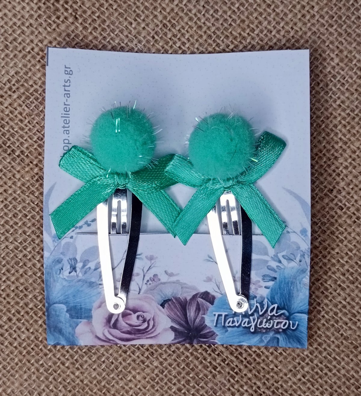 Σετ 2 Χειροποίητα Κλιπ Μαλλιών – Πράσινα φιογκάκια με πομπομ