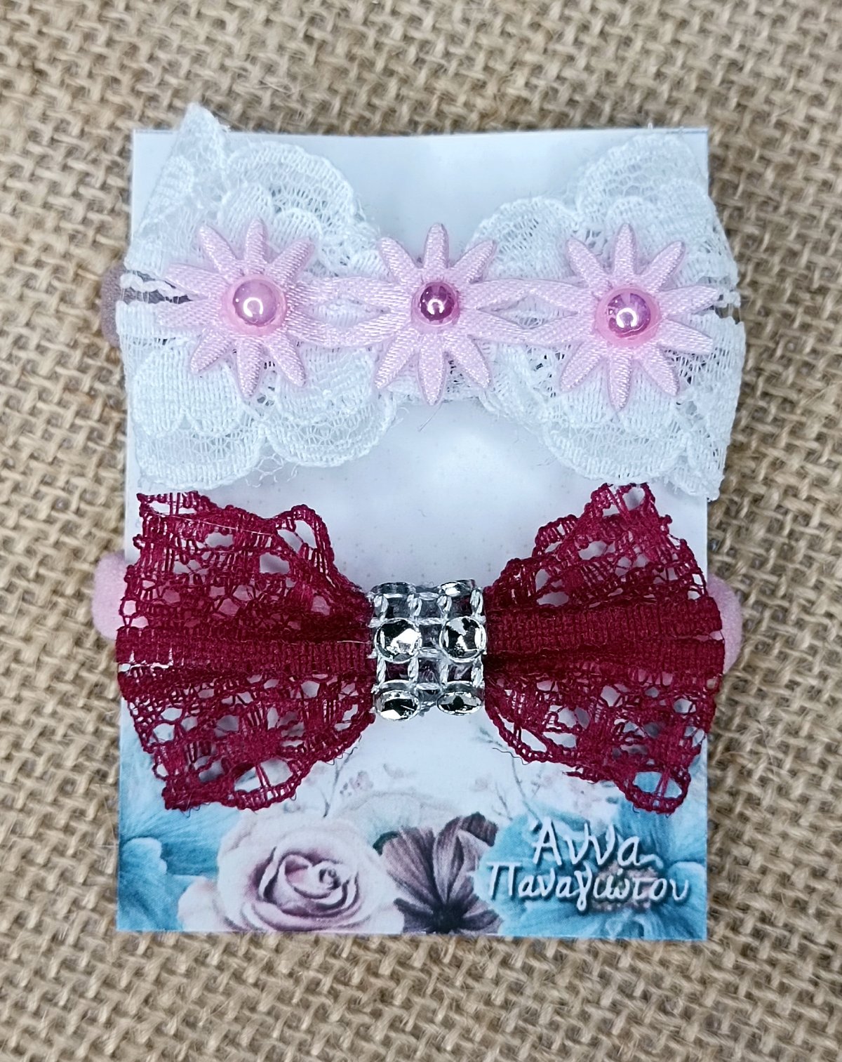 Σετ 2 Χειροποίητα Λαστιχάκια Μαλλιών – Λευκός φιόγκος & μπορντώ φιόγκος