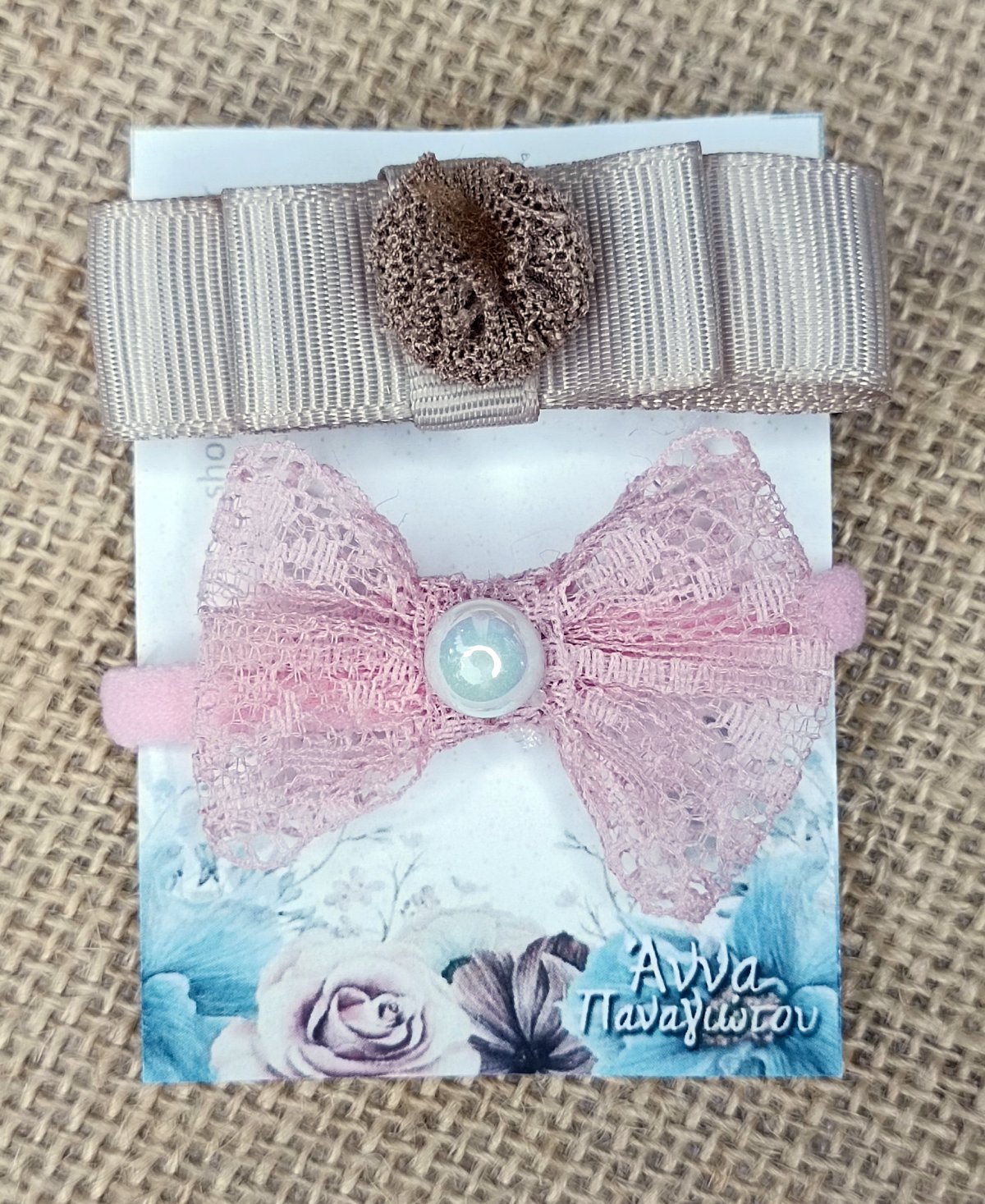 Σετ 2 Χειροποίητα Λαστιχάκια Μαλλιών – Ροζ φιόγκος & Καφέ κορδέλα