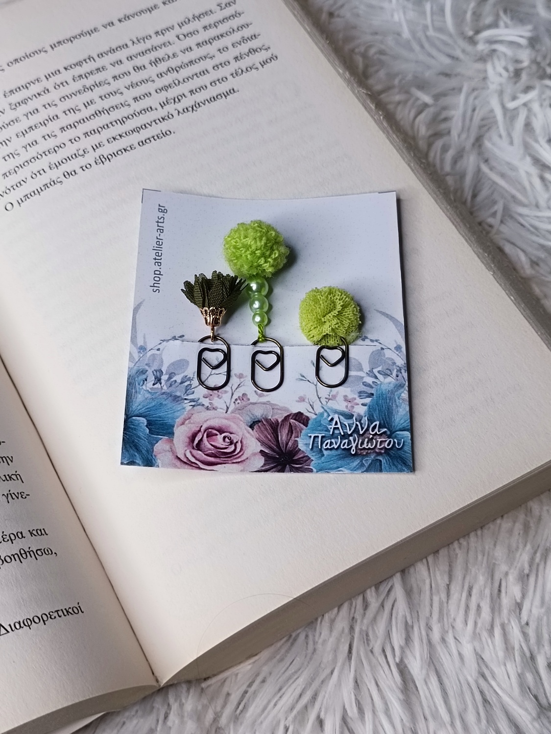 Οργανώστε το διάβασμά σας με στυλ! Αυτό το μοναδικό σετ περιλαμβάνει τρεις χειροποίητους σελιδοδείκτες σε σχήμα συνδετήρα, διακοσμημένους με πλεκτά pom-pom σε δροσερό λαχανί χρώμα, πέρλες και μια κομψή υφασμάτινη φούντα. Είναι ιδανικοί για να κρατούν τη θέση σας στο βιβλίο, το ημερολόγιο ή το planner σας χωρίς να πιάνουν χώρο. Μια υπέροχη ιδέα για ένα μικρό, προσωπικό δώρο σε κάθε βιβλιόφιλο.
