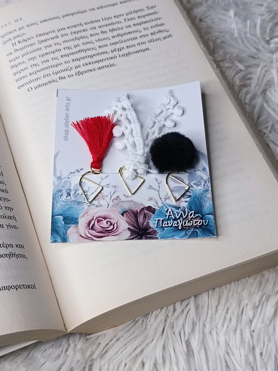 Οργανώστε το διάβασμά σας με στυλ! Αυτό το μοναδικό σετ περιλαμβάνει τρεις χειροποίητους σελιδοδείκτες σε σχήμα συνδετήρα, διακοσμημένους με pom-pom και μια κομψή φούντα. Είναι ιδανικοί για να κρατούν τη θέση σας στο βιβλίο, το ημερολόγιο ή το planner σας χωρίς να πιάνουν χώρο. Μια υπέροχη ιδέα για ένα μικρό, προσωπικό δώρο σε κάθε βιβλιόφιλο.